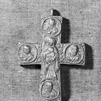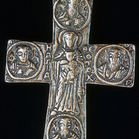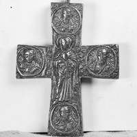 - Cast metal reliquary cross. In roundels on each arm of the cross is an icon of an evangelist. In the center is the Theotokos and the Christ Child.