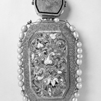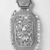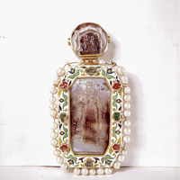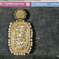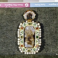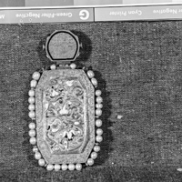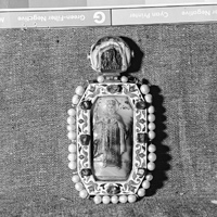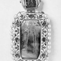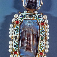 An icon of St. Catherine has been carved into the onyx brooch. The frame of the brooch has been adorned wih a floral motif and inlaid gems. A wire of gold supports a course of beads around the brooch. Above the icon of St. Catherine is circular icon of Christ attached to the brooch by a hinge. On the reverse of the Christ Icon is a Greek inscription. The reverse of the brooch has been adorned with a vine and flower motif around the gold border surrounding the central panel that is slightly raised and decorated with a similar motif, here in polychrome.