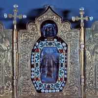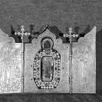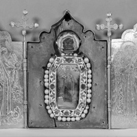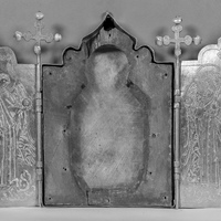 In the center of the triptych is a niche that snugly fits the onyx brooch. Surrounding the niche are circular vine and tendril motifs. The top of the central panel culminates in a pointed arch smilar to those used in Islamic architecture. Each hinge is crowned with a Greek cross. On each wing is an archangel that has been carved in low relief. The Archangel Michael has been incised into the left wing and the Archangel Gabriel on the right wing.