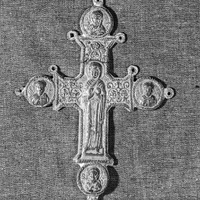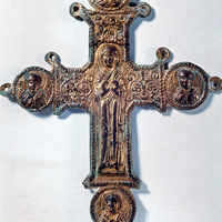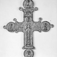 - Flaring cross with roundels bearing images of saints (evangelists?). Occupying the majority of the lateral arm of the cross is the Virgin Blachernitissa (Mary in the orans pose). Trefoil ornamental patterns have been included beside the Virgin and above her.