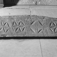 Stone tombstone with four roundels decorated with diamond and cross motifs framed by a sharply incised rectangular border. A Greek inscription has been carved around the third roundel. The spacing between each roundel is not consistent. Whether space has been provided for an inscription to be added or if this is a decorative choice is unclear. The hand of the carver does not appear to be a well or formally trained one.