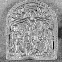 - The Crucified Christ occupies the greatest portion of the medallion. The cross is not explicitly shown, however the positioning of Christ's body in the shape of a crucifix gestures towards this scene as the subject matter. Two now obscured saints stand next to Christ and two angels float on either side of Christ's head.
