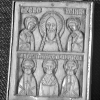 - The Theotokos is shown with Christ and another saint in the upper register of the plaque carved in low relief. Christ's hair appears to be braided at the ends and radiates outwards from his head. Three saints occupy the lower register.