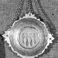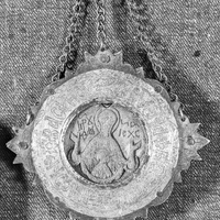 Suspended by a chain composed of three links is a medallion adorned with an image of the Virgin Blachernitissa carved in low relief. Here, both the Theotokos and the Christ Child are rendered as busts. The Theotokos holds the orans pose - arms outstretched at shoulder height in a gesture of prayer. The Christ Child's hand gestures a now difficult to interpret, however, in other images of the same iconographic type, he is shown with his hands out to either side as Christ Emmanuel. The medallion is set within a metal mount that contains a Greek inscription and an ornamental border that alternates between sharp triangular motifs and semi-circles.