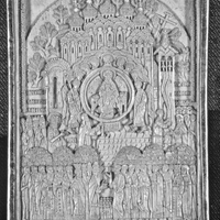A frieze of saints stand on the dado level of the plaque and are interrupted by a smaller cluster of figures in between them. At either side of the small group of figures, one of the saints gestures upwards drawing the eye up to the slightly larger saints in the register above. At the left, a bearded saint holding an inscribed document that seems to fly like a standard or flag away from his body, stands just beneath the seated Theotokos and Christ Child. His head connects ever so slightly with the border of the medallion that encompasses the holy Mother and Child. To his left, is another bearded man (St. John the Baptist?). He holds out his hands guiding the eye again towards the Theotokos. To the right is another cluster of figures who similarly hold their hands outwards in praise of Mary. One of them seems to be ringing the bells in the campanile.