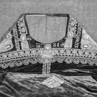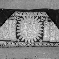 On either side of the vestment are saints holding their arms out in a gesture of blessing. - Medium