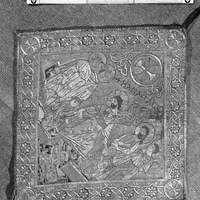 Christ is shown standing triumphantly near the center of the textile pulling up Adam and Eve with each hand. Four saints, two on each side of Christ, are also present. These saints have not been identified with a monogram or name however, standard iconographic depictions of the Anastasis often show Seth and David (proper right?) and John the Baptist and Solomon (proper left?) (Weyl Carr, "Anastasis", Oxford Dictionary of Byzantium).