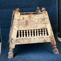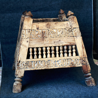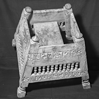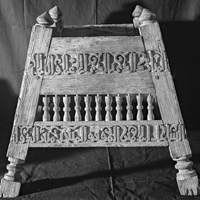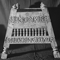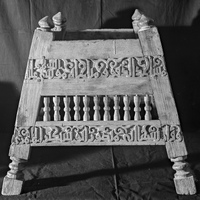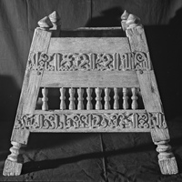 Wood-carved Koran stand with two calligraphic bands (one around the narrower, top part of the stand, and the other encircling the wider, bottom part of the stand).