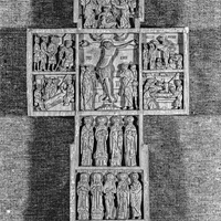 This cross is composed of nine scenes five of which are scenes from the Passion Cycle. Scenes from the Passion Cycle are depicted in the panels that compose the crossing section of the crucifix. The story is told from left to right in its own sort of cycle. In the top panel of the proper right side of the cross is a bound Jesus appearing between two soldiers before Pontius Pilate. The central and largest panel is the Crucifixion. The top scene on the proper left arm of the cross depicts the Deposition from the Cross and just below it is the Entombment. The bottom, proper right scene is of the Holy Women at the Tomb discovering that Christ's body was no longer there. The crowning scene of the cross has yet to be identified. Seated at a table are two saints and an angel. In the foreground are three figures, two of which hold up perhaps holy objects (they cover their hands with a cloth so as not to touch the bowls or cups they hold) and a figure sacrificing (?) an animal. The three scenes in the lowermost section of the cross are populated with saints.