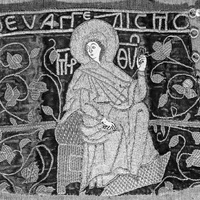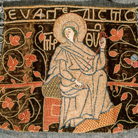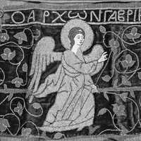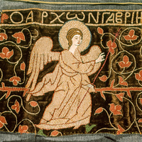 Images 1 & 2: The Angel Gabriel is shown at the center of the textile, gesturing and advancing to the right. His hair is formed of brown coils that seem to flow, at least partially, down his neck. His eyes are asymmetrical with one being more elliptical in shape with a slight flare to proper right and the other being circular. His lips are slightly pursed and are of the same rusty red color as his outline, staff, and the flowers on vines that flank him. He wears a pair of green boots. A solid horizontal line with thorns (?) breaks up the the laissez-faire movement of the vines. Gabriel's monograph (ΟΑΡΧΩΝΓΑΒΡΙΗ) appears directly above him, in a top lintel. The textile weaver has used a lowercase omega in the monogram instead of an uppercase one.