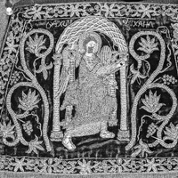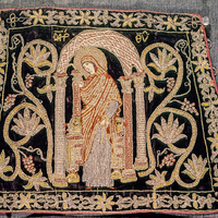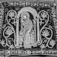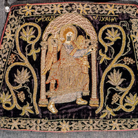 Images 1 & 2: The Archangel Michael occupies the center of the textile. His face has been slightly damaged. He is placed beneath a ciborium (canopy) that is not quite large enough for him. Michael appears as if he is striding forwards and reaching out of the scene perhaps towards Mary who appears in this same set of Epimanikiai. The columns appear to be corinthian and the canopy has been adorned with a web-like pattern of intersecting diamond motifs. On either side of the canopy are vines with flowers nearly equal in size with Michael and the architectural setting. A floral motif borders the scene. Michael's name has been stitched just above the canopy. It is curious that Michael's name appears at all as it is the angel Gabriel that comes to Mary in scenes of the Annunciation to deliver the news that she will bear the son of God.
