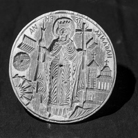 Saint Catherine of Alexandria holding a cross and torch. Her garments appear to be decorated with palm leaves. Along the rim of the bread seal are other symbols related to Catherine, especially the wheel with which she was martyred. There are also two books and a globe. To the right of the saint is a representation of St. Catherine's Monastery.