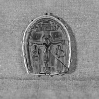 Image 2: Medallion in a metal mount with the Crucifixion. St. Mary and perhaps St. John accompany Christ on the cross. Behind the two figures are backgrounds of some kind despite the scene's usual outdoor setting. Saints or angels appear in the second horizontal arm of the cross.