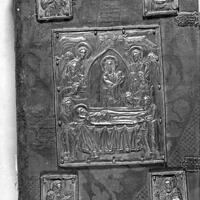 - Dormition (Koimesis, κοιμεσις) of the Virigin occupies the center of the cover and is accompanied by depictions of the Evangelists at each corner.