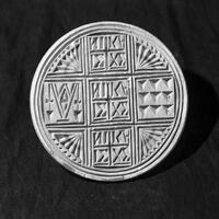 - Fan motifs in quadrants with other ornament and monograms. In the three vertical panels is the monogram of Jesus Christ the Victor (ΙΣ ΧΣ / ΝΙ ΚΑ).