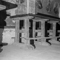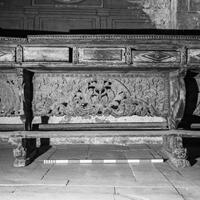 Image 1: Part of the table in the refectory with two symmetrical dragons breathing fire and two angels supporting a bell(?) or other ornamental motif. An egg-and-dart motif borders the scene only on three sides. Drawers are placed just above the carving and a low bench for kneeling or perhaps resting one's feet occupies the lowest course. The legs of the table appear to be carved into the shape of animals, perhaps a lion or some other feline. Carved corbels separte each carved panel from the next.