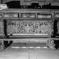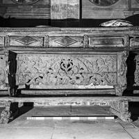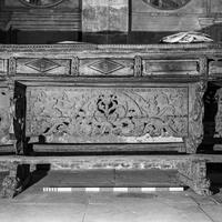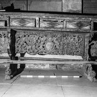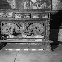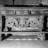 Image 8: This carving is identical to image 1. Part of the table in the refectory with two symmetrical dragons breathing fire and two angels supporting a bell(?) or other ornamental motif. An egg-and-dart motif borders the scene only on three sides. Drawers are placed just above the carving and a low bench for kneeling or perhaps resting one's feet occupies the lowest course. The legs of the table appear to be carved into the shape of animals as well, perhaps a lion or some other feline. Carved corbels separte each carved panel from the next.